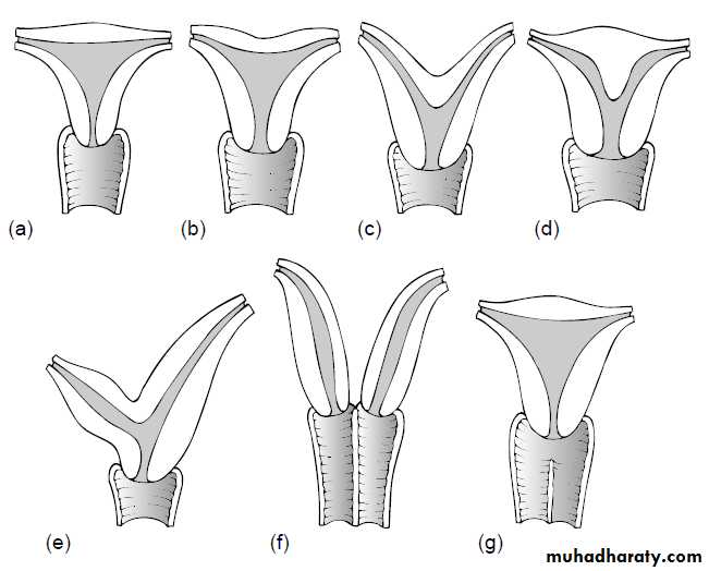 -Uterus bicornis (26%): There is varying degrees of fusion of the muscle walls of the two ducts. − Uterus bicornisbicollis: There are two uterine cavities with double cervix with or without vaginal septum. − Uterus bicornisunicollis: There are two uterine cavities with one cervix.