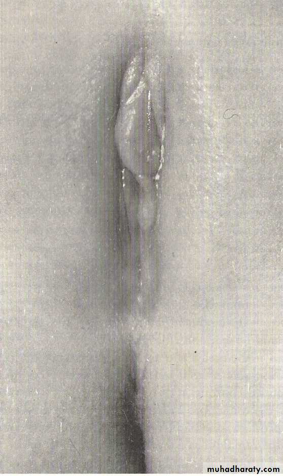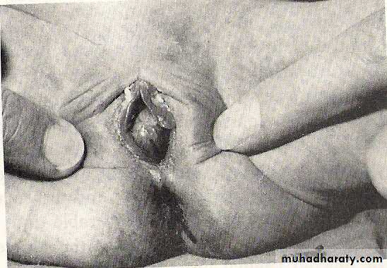 3-labial adhesion: Adhesion of the labia minora in the midline is the usual presentation. This vertical line of fusion distinguishes labial agglutination from imperforated hymen or vaginal atresia.