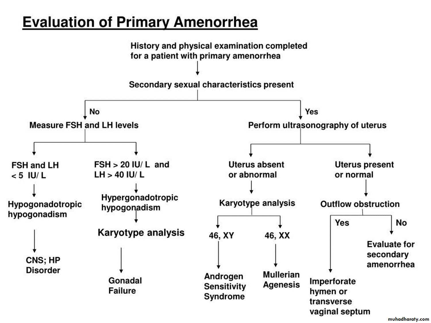 Patients with outflow obstruction have a 46,XX karyotype, female secondary sexual characteristics, and normal ovarian function Thus, the amount of uterine bleeding is normal, but its normal path is obstructed.