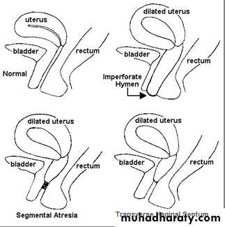 An imperforate hymen or vaginal septum may present with a history of amenorrhea and cyclical abdominal pain difficulties in urination and even urinary retention, difficulties in defecation.