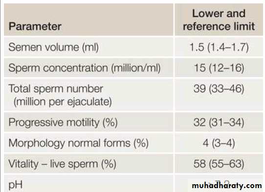 Semen fluid analysis: the only routine investigation on the male side is a (SFA). Most centers recommend between a 2-4day abstinence from ejaculation before providing the semen sample. if the initial SFA is abnormal it should be repeated 3 months later, to allow adequate time for spermatogenesis.