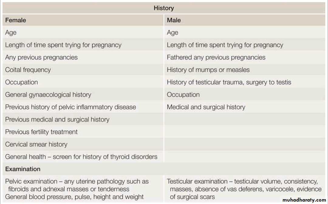 A thorough & detailed history must be taken from patients presenting with subfertility Table 1. In many clinics a template is employed to ensure all these features are covered.