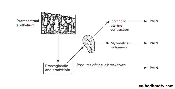1° dysmenorrhoea is idiopathic menstrual pain without identifiable pathology.Usually occurs before age 20, pain in the menstrual cycle is a feature of ovulatory cycles and is due to uterine vasospasm and ischaemia, nervous sensitization due to PGs and other inflammatory mediators, and uterine contractions. A maternal or sibling history of dysmenorrhea is very common and the problem usually starts soon after menarche.