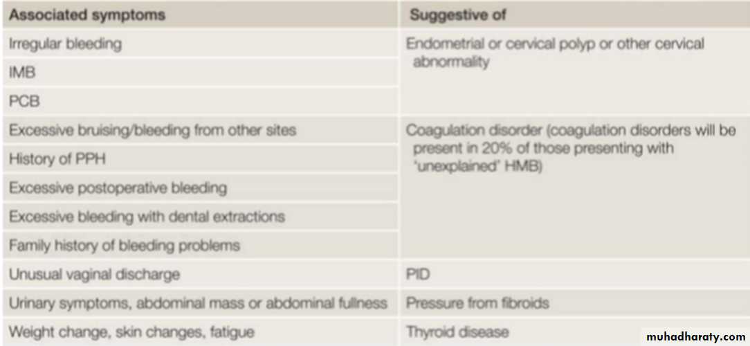The regularity of the menstrual cycle, length of time of problem, Amount of blood loss, relationships of bleeding to sex and to menstrual cycle, or to the last menstrual bleed in the case of postmenopausal bleeding (PMB) are important questions.In younger women it is important to question whether HMB started at menarche, as this is much less likely to be associated with pathology.
