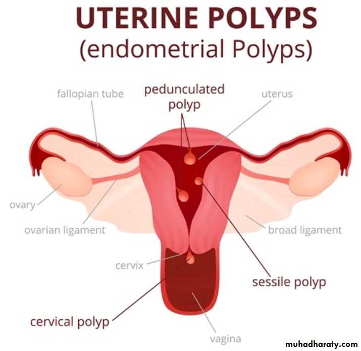 Are localized overgrowths of endometrial tissue, containing glands, stroma, and blood vessels, covered with epithelium. Endometrial polyps are most commonly found in reproductive-age women, and estrogen stimulation is thought to play a key role in their development. As such, polyps are rarely found before menarche. The majority of endometrial polyps are benign. Transvaginal ultrasound detected asymptomatic polyps in up to 12% of women undergoing routine gynecologic examination; small endometrial polyps smaller than 1 cm appear to regress spontaneously. Women with symptomatic polyps can be treated safely and effectively with operative hysteroscopy.Adenomyosis