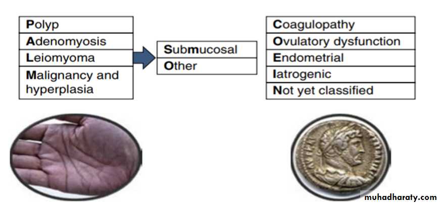 The new classification system PALM-COEIN was introduced by the International Federation of Gynecology and Obstetrics (FIGO) and is supported by the American College of OB/GYN (ACOG) classifies AUB by both the pattern and the etiology of the bleeding.The acronym AUB is followed by the letters PALM-COEIN and a subscript 0 or 1 associated with each letter to indicate the absence or presence, respectively, of the abnormality. For example, a patient with abnormal bleeding due to a polyp would be described as AUB-P1A0L0M0-C0O0E0I0N0.