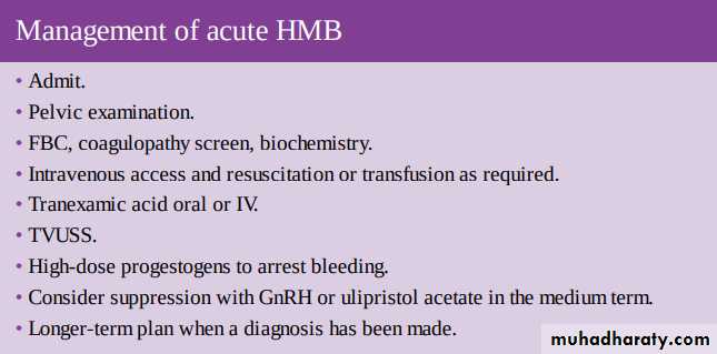 Not infrequently women are admitted to hospital with AUB. They require stabilization, examination to exclude cervical abnormalities and pelvic masses, medication to arrest bleeding and correct anaemia, investigation and discharge with a long-term plan to avoid further admissions. In women who are bleeding heavily and are hemodynamically unstable, the quickest way to stop acute bleeding is with curettage. This should also be the preferred approach for older women and those with medical risk factors for whom high-dose hormonal therapy may pose a great risk.Surgical Therapy:
