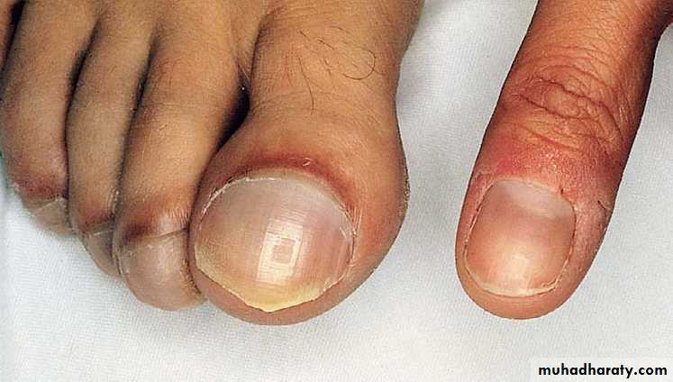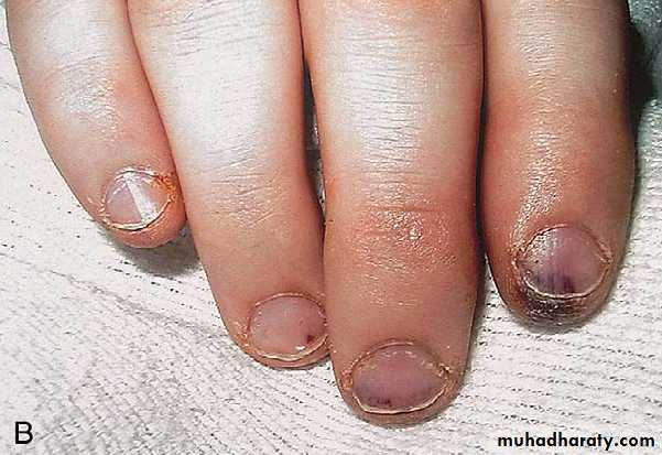 ° Splinter hemorrhage—linear lesions beneath nail beds