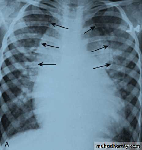 Investigations:1. General: viral studies , elevated ESR Elevated Creatinine kinase–MB isoenzymes (CK-MB) , Lactate dehydrogenase isoenzyme 1 and Troponin I.2. CX-ray : cardiomegaly and pulmonary edema .3. MRI4. Echo5. ECG: Low-voltage QRS (< 5 mm throughout the limb leads) is the classic pattern,prolonged PR interval, ST depression and T-inversion. Sinus tachycardia, arrythmias and AV block