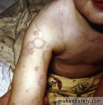 − Skin findings—rare; late findings (uncommon in treated patients); represent vasculitis