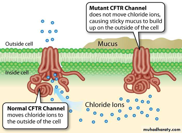 Dysfunction of CFTR inability to secrete Cl ion & excess absorption of Na across Resp.epithelial cell membrane movement of water from airway lumen to inside the cell insufficient water to hydrate secretions viscous secretions hard to clear by mucocilliary mechanism.