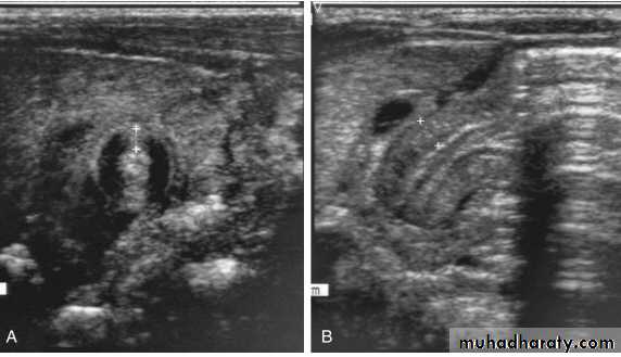 A, Transverse sonogram demonstrating a pyloric muscle wall thickness of >4 mm (distance between crosses). B, Horizontal image demonstrating a pyloric channel length >14 mm (wall thickness outlined between crosses) in an infant with pyloric stenosis.