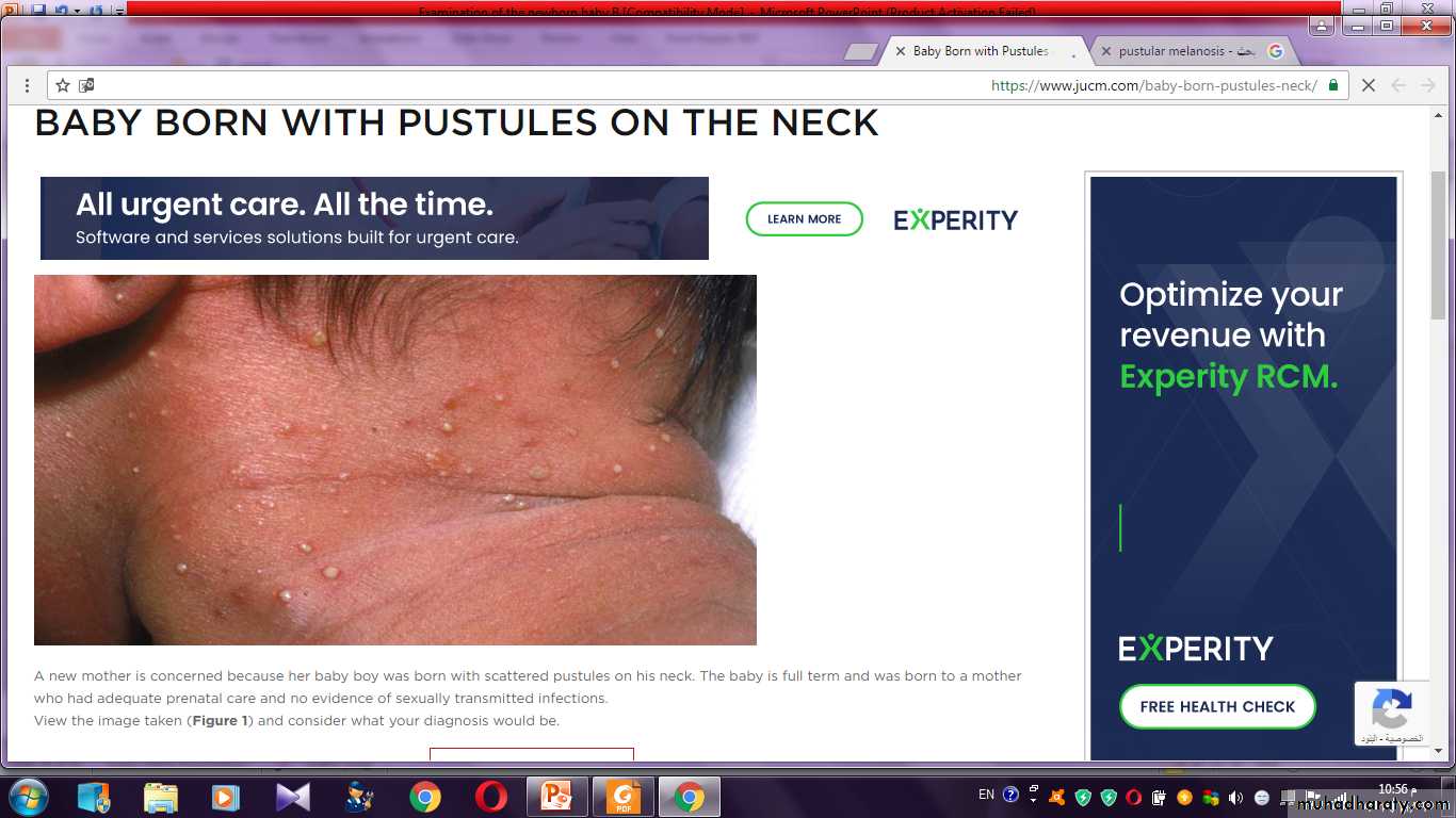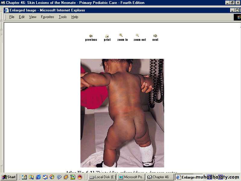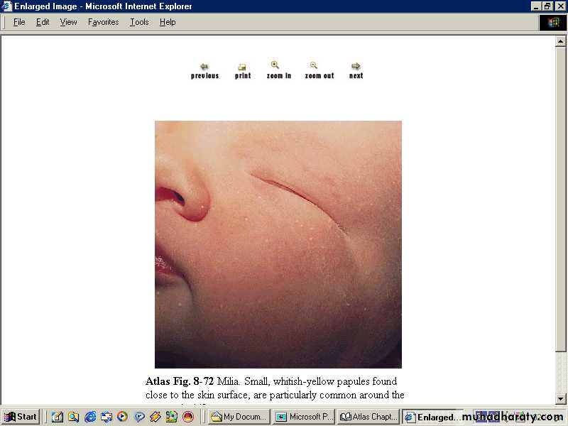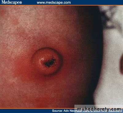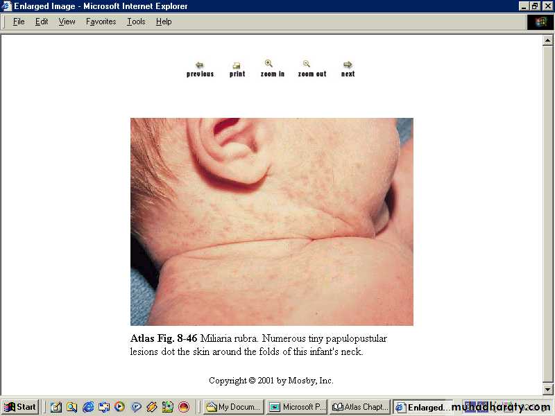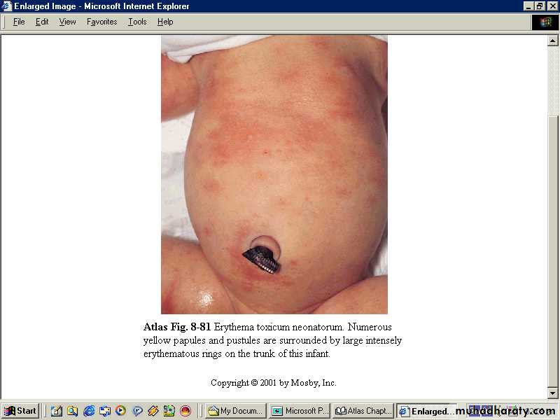 Erythema toxicum:benign self limited, the lesion are firm yellow white, 1-2 mm papule or pustules with a surrounding erythematous flare they may be sparse or numerous peak incidence is in the 2nd day of life and may last for 1 week.