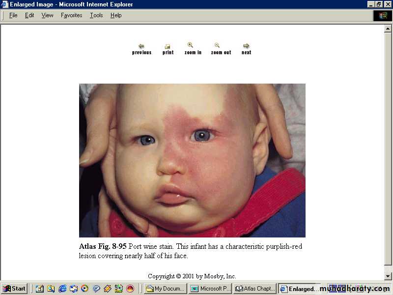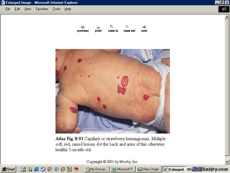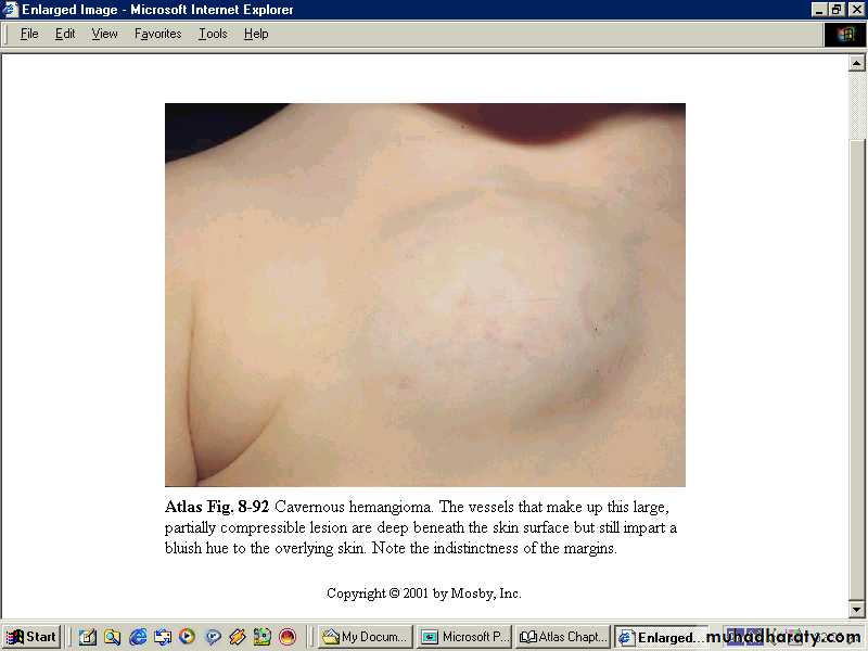 Bright red capillary hemangiomas protuberant, compressable, any part of the body can be affected.Cavernous hemangioma: