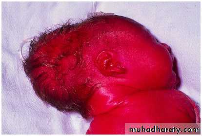 limited by the sutures of the skull it is soft to fluctuantstarts few hours after delivery and it lasts several weeks to