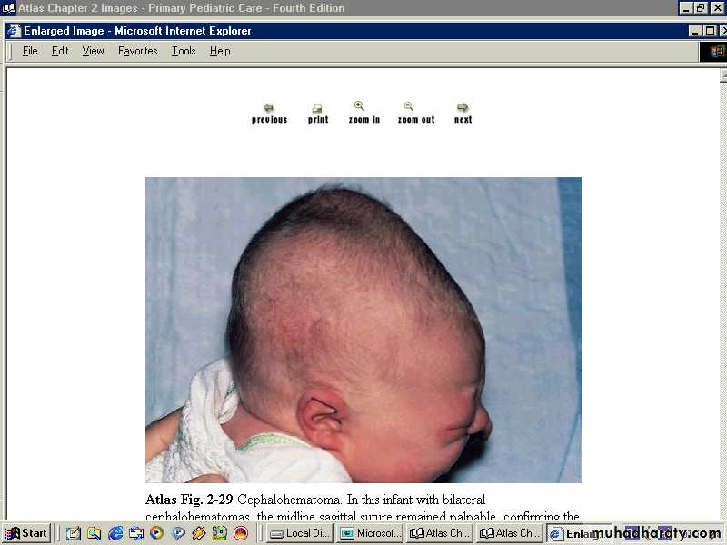 The head circumference of all newborns should be plotted on a growth chart to identify an excessively small head (microcephaly) or excessively large head (megalencephaly).The head may be molded particularly if the baby is the 1st born. A rounded symmetrical head is seen if a baby is born by C-section or breach delivery, whereas babies born by vaginal vertex delivery usually has a head that is elongated occipitally with some overriding of the sutures & possibly a caput succedaneum or cephalhematoma.