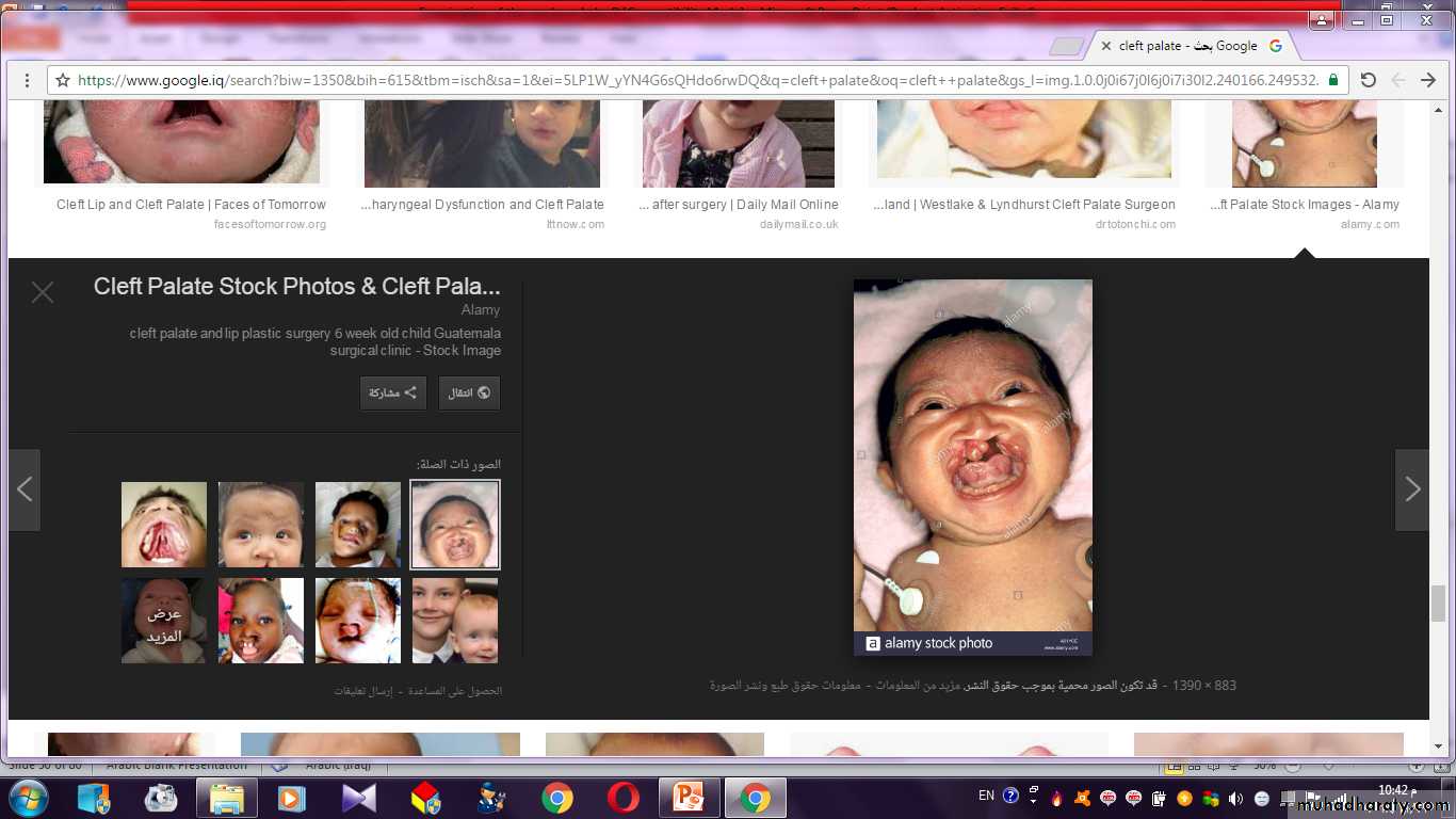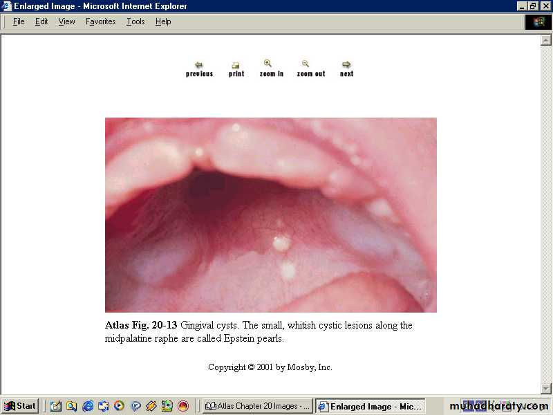 The hard & the soft palate should be inspected for a cleft palate. Epstein pearl may be seen on the hard palate.