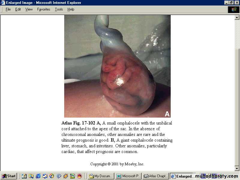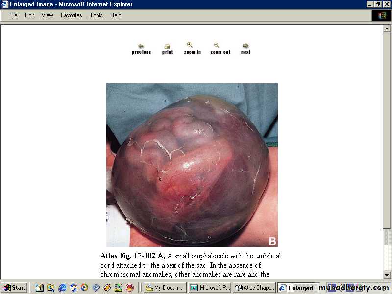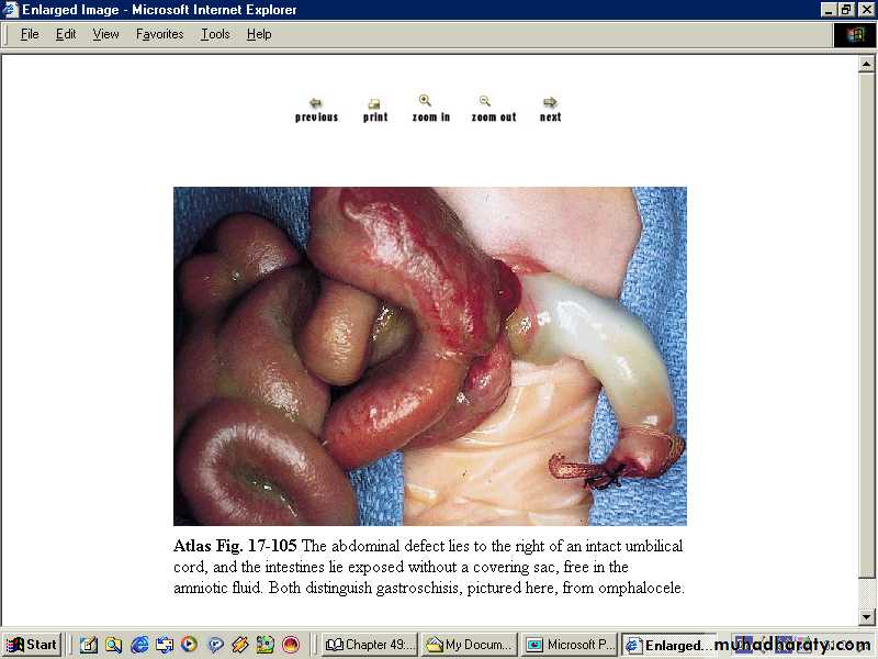 The abdominal defect lies to the right of an intact umbilical cord, and the intestine lie exposed without a covering sac, free in the amniotic fluid.gastroschisis