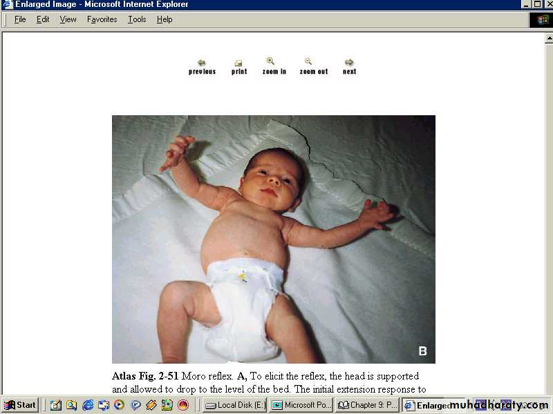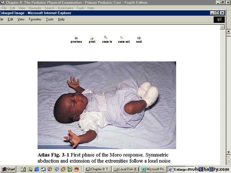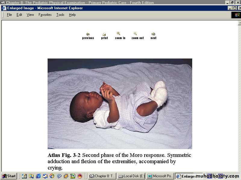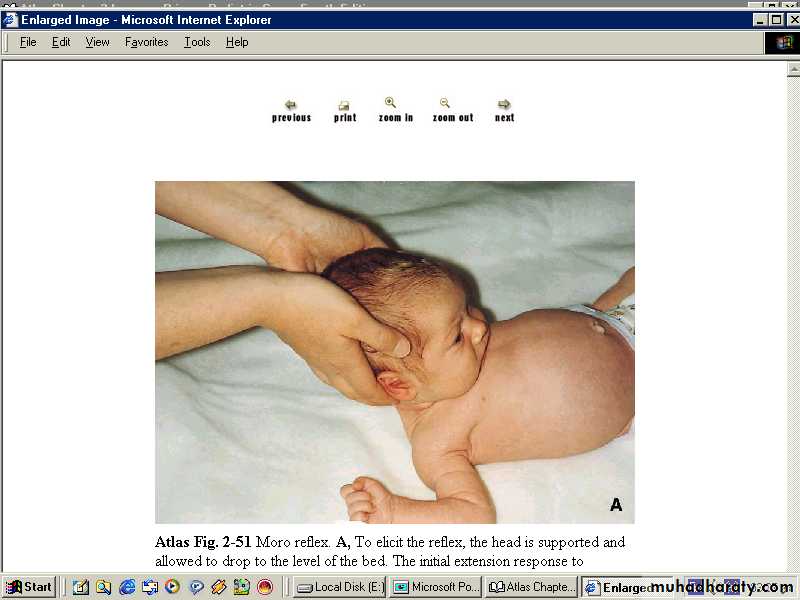 Moro reflex:To elicit the reflex, the head is supported and allowed to drop to the level of the bed. There will be initial extension response of the upper limbs, followed by flexion and crying.