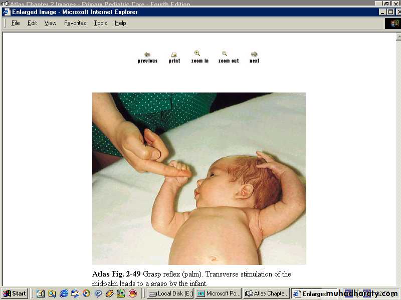Grasp reflex: it is elicited by placing a finger or object in the open palm, the normal infant will grasp the object and with attempted removal the grip is reinforced.