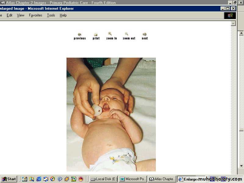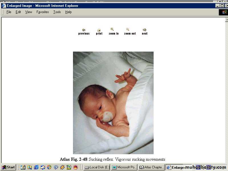 The infant opens the mouth and turns the head towards the pacifier or the examiner finger stimulating the cheek.Sucking reflex:-