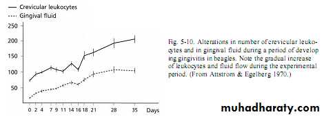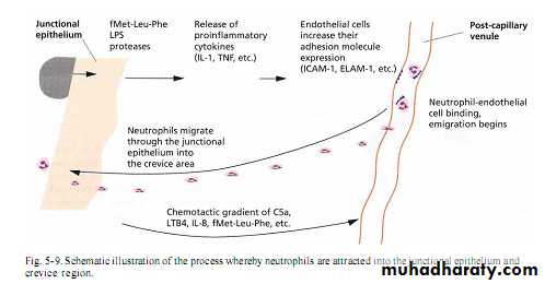 Neutrophil,macrophage & lymphocyte move to the site, first adhere to vessels walls (margination) then leave capillaries by migration through wall then to gingival sulcus to form what is called crevicular leukocytes.