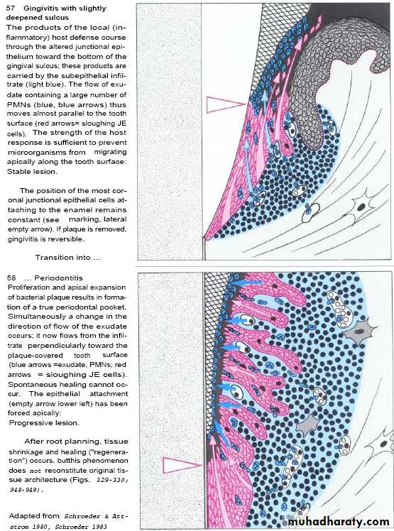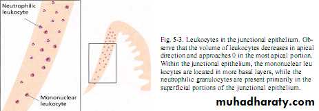 Neutrophiles & Macrophages seen in junctional epithlium that continuously migrate to gingival sulcus which mediated by chemotactic factor from plaque.