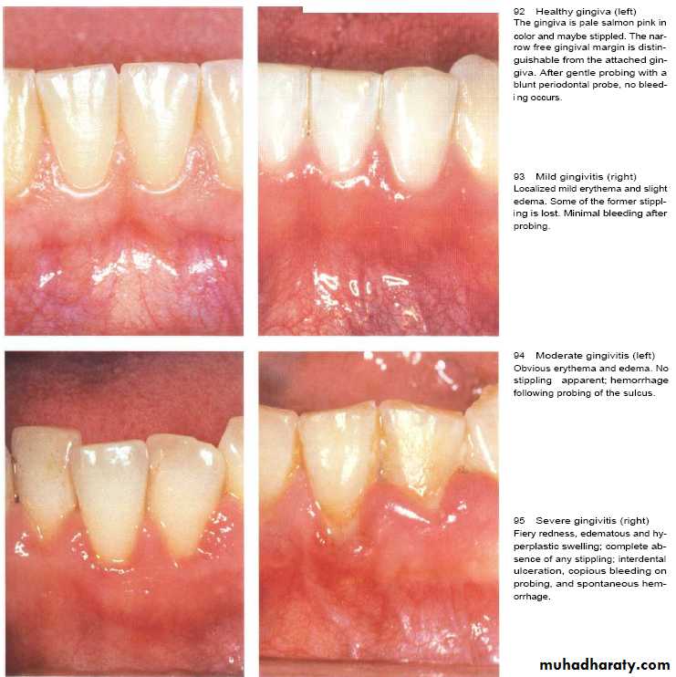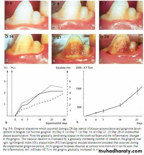Inflammation develops within second day of undisturbed plaque accumulation .Clinically; slight color & texture changes of marginal gingiva then after 10 -20 days, overt gingivitis with marked redness ,swelling & bleeding on probing (reversible).