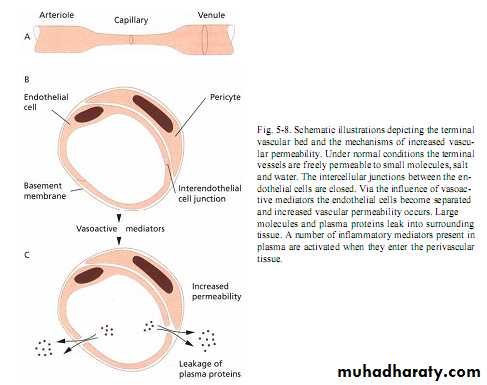 Dilation of arteriols,capillaries & venuls.Hydrostatic pressure elevated with formation of intercellular gaps of capillaries or venular endothelial cells lead to increase in permeability of veins to fluid & protein.