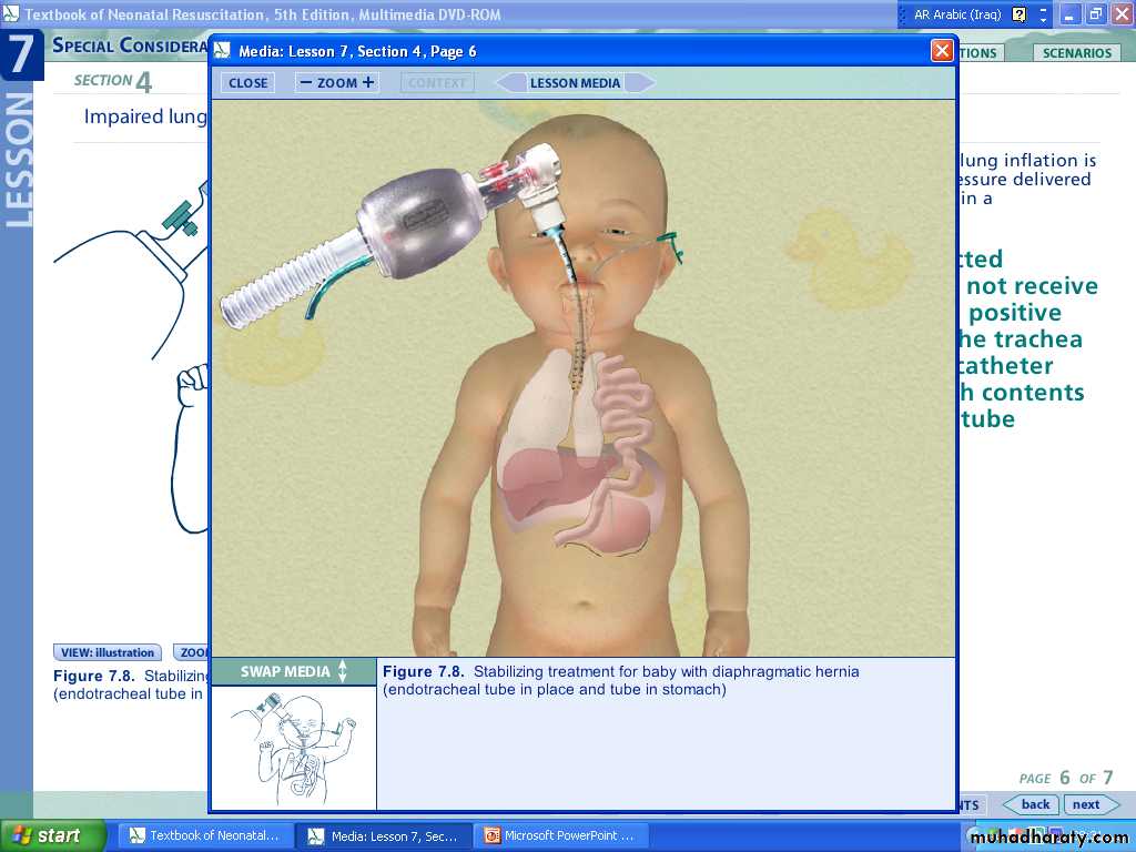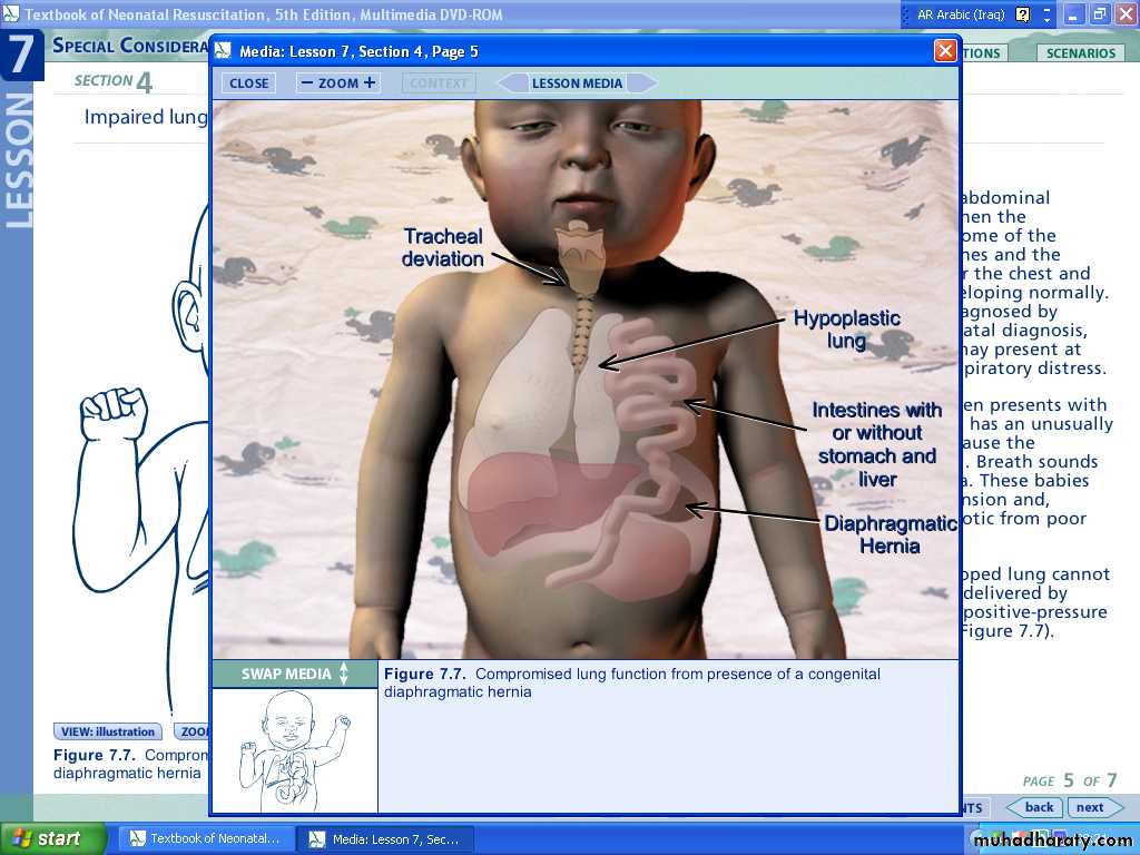 Congenital Diaphragmatic HerniaEtiology:Herniation occurs most often in posterolateral segment of diaphragm more often in left side due to failure of pleuroperitoneal canal to close[foramen of Bochdalek].Less frequently the herniation in the retro sternal area[foramen of Morgagni].The vast majority, 90%–95%, are of the Bochdalek type.As many as 30%–40% of babies with CDH have additionalcongenital anomalies, most commonly of the heart, central nervous system, and genitourinary system.