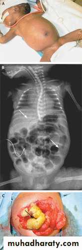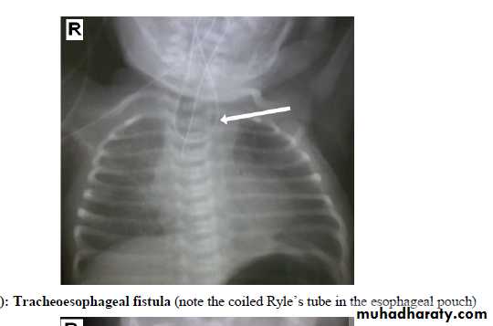 Resuscitation of newborn is mandatory prior to surgery1-position head and thorax higher than abdomen to facilitate downward displacment of abdominal organs.2-nasogastric intubation with intermittent suction decrease air and fluid in herniated viscera.Esophageal Atresia&Tracheoesophageal FistulaIn 85% of cases fistula between trachea and distal esophagus accompanies atresia. Less commonly, EA or TEF may occur alone.One third of affected infants are born premature.