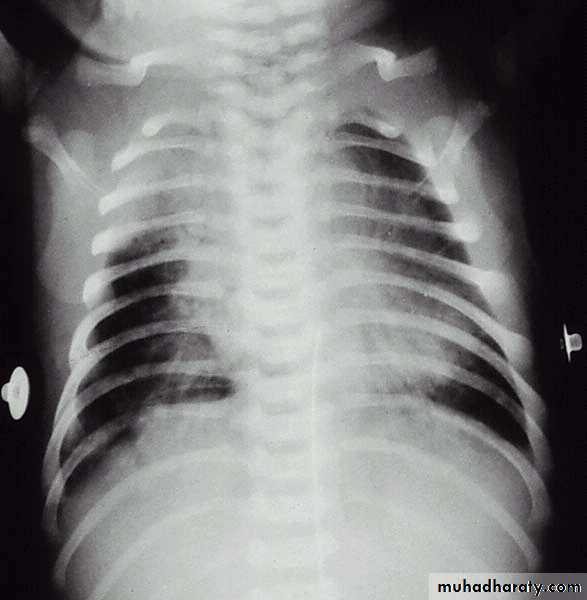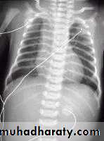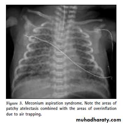 Meconium may be aspirated before, during, or just after birth leading to high incidence of pneumonia& pneumothoraces. Clinical features: Meconium aspiration pneumonia characterized by tachypnea, hypoxia, hypercapnia,& small airway obstruction that produce air trapping,& extra-alveolar leaks. Complete small airway obstruction produces atelectasis within 24-48 hr, chemical pneumonitis develops in addition mechanical effect of airway obstruction.