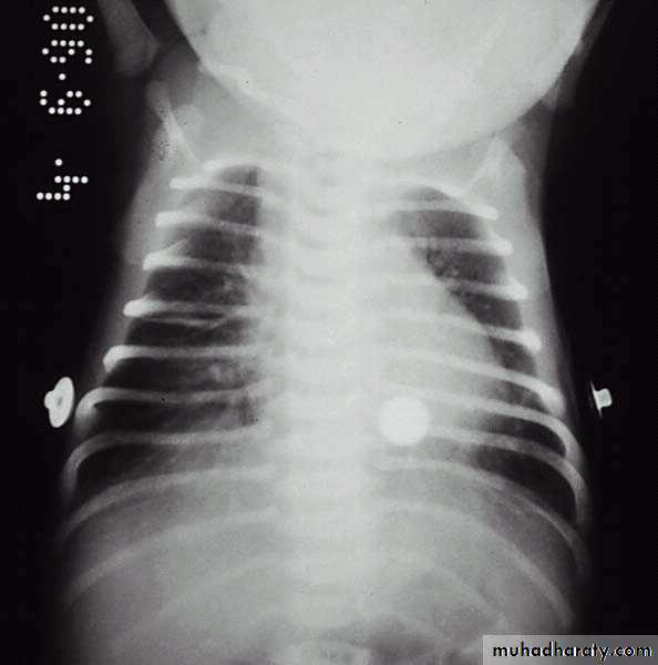 Chest x-ray:- Patchy infiltrates, overdistention , flattening of diaphragm, increase anteroposterior diameter& high incidence of pneumomediastinum& pneumothorax.