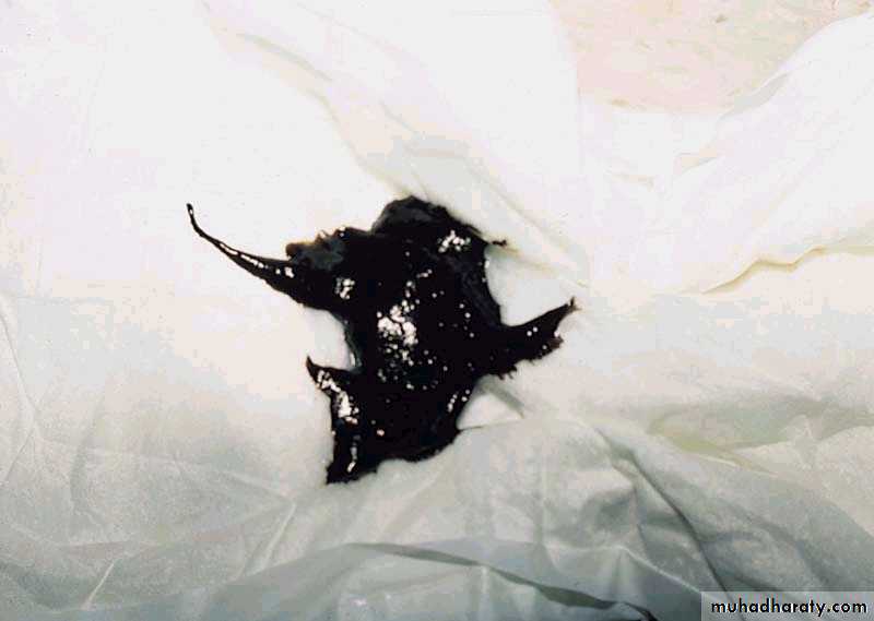 Meconium Aspiration SyndromeMeconium is the first intestinal discharge from newborns which is a viscous, dark green substance composed of intestinal epithelial cells, lanugo, mucus, and intestinal secretions, such as bile. Meconium stained amniotic fluid is seen in 15% of predominantly term, growth retarded,& post term deliveries. Although the passage of meconium into amniotic fluid is common in infants born in the breech presentation, meconium-stained fluid should be considered a sign of fetal distress& suggest in utero asphyxia, hypoxia, acidosis. Meconium inactivates surfactant . Meconium aspiration syndrome develops in 5% infants with meconium stained amniotic fluid.