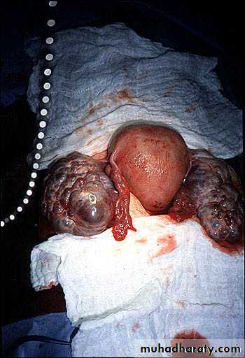 • complication of theca lutein cyst of ovary (rupture, torsion).molar pregnancy produces excessive hCG , which stimulates excessive growth of ovaries.