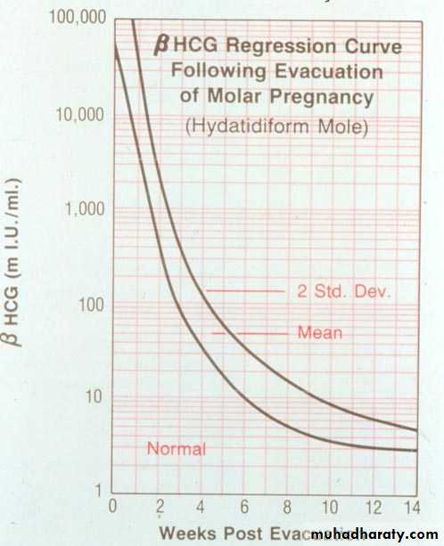 postmolar surveillance with serial quantitative serum -hCG levels should be the standard. Titers should be monitored following uterine evacuation at least every 1 to2 weeks until they become undetectable.