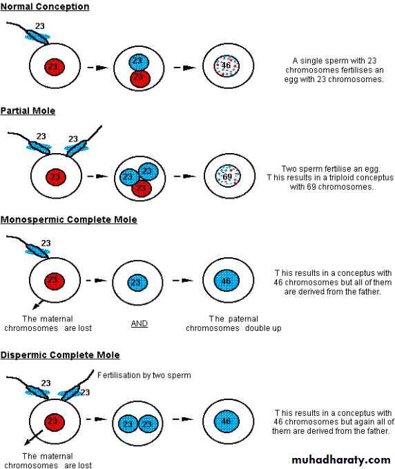 In normal fertilization single sperm with 23 chromosome fertilize an ovum with 23 chromosome.Hydatidiform mole occurs because of an abnormal fertilization process.