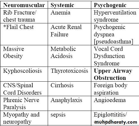 4- Chronic [recurrent/months] causes of dyspnea are COPD, CHF, Neuromuscular problems, pulmonary hypertension, anemia, and asthma.