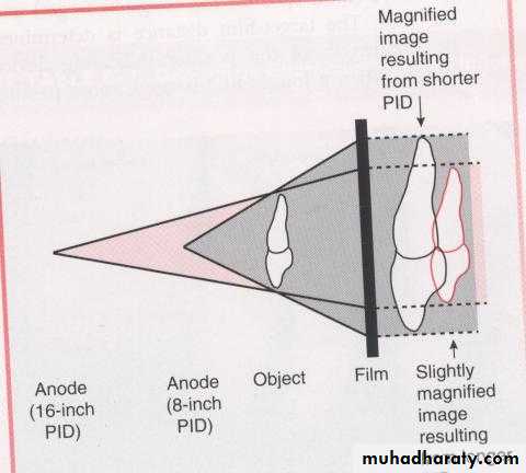 : Also known as source to film distance is the distance between the x-rays (focal spot of tungsten target) and the film. The target film distance is determined by length of the position indicating device, when a longer PID is used more parallel rays from the middle of x-ray beam strike the object rather than the diverging x-rays from the periphery of the beam, as a result a longer PID and target film distance result in less image magnification .