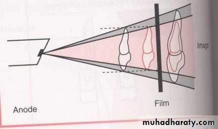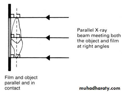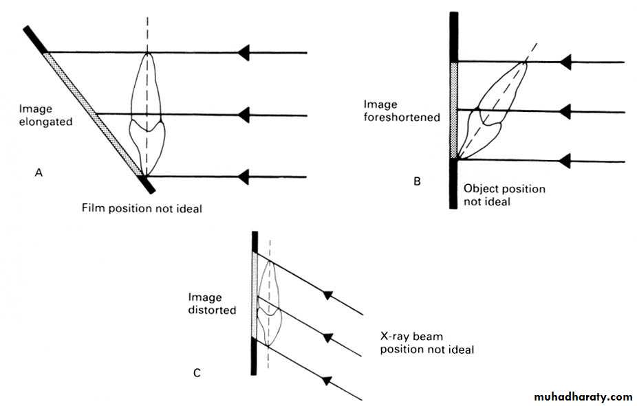 Object–Film Alignment: In order to minimize dimensional distortion the object and film must be parallel to each other if the object and film are not parallel an angular relation ship result. An angular relation ship produce a variation of distances between the teeth and film that result in distorted image.