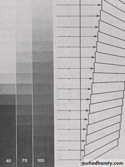 3- Source–Film Distance: The density of a film also depends on the amount of radiation reaching the film or the distance of the film from the source to the film. The inverse square law state that the x-ray beam varies inversely with the square of distance from the source. Thus we change the length from 8 inch to 16 inch the intensity of x-ray beam reach the film would be 1\4 and this affect density and must be compensate by increasing exposure time.