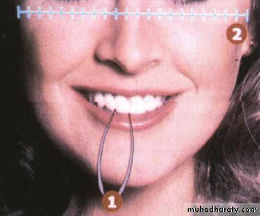 The distance measured between the two commisures (angles of the mouth ) will represent the width of the upper six anteriors from the distal surface of the canine to the distal surface of the other canine.Canine eminence