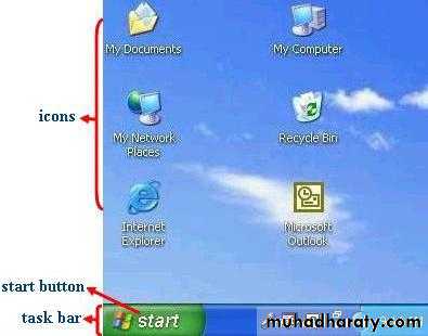يتكون سطح المكتب من مجموعة من العناصر:-1-الأيقونات ( icons ) : وتمثل تطبيق أو مجلد أو ملف ولكل أيقونة شكلها الخاص.