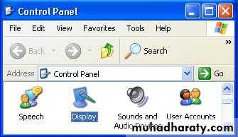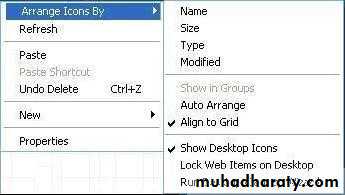 السحب:ضع راس المؤشر فوق أيقونة على سطح المكتب استمر بالنقر وحرك الفأرة أطلق زر الفارة لتبقى الأيقونة بمكانها الجديد