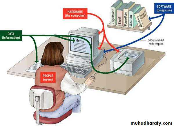 1 – مكونات المادية (المعدات) ( Hardware) معدات الكمبيوتر هي عبارة عن قطع وأجهزة الكترونية وهذه الأجهزة و القطع الكترونية يمكن رؤيتها بالعين و لمسها فهي تعتبر الجزء المادي من الكمبيوتر , ويتم التحكم بها وأدارتها عن طريق البرامج وأنظمة التشغيل تسمى تعريفات الأجهزة ومن الأمثلة على المعدات المعالج الدقيق Processor, اللوحة الرئيسية Mother board, الفأرة mouse و القرص الصلب Hard disk ..2.البرمجيات (Software) :