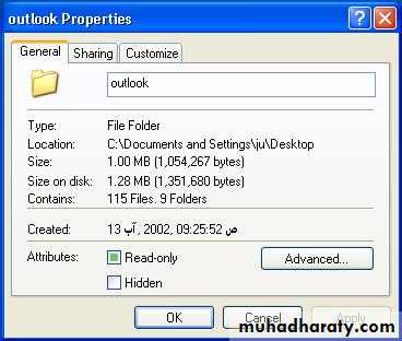 أنقر بالزر ألأيمن للفأرة فوق المجلد او الملف المراد معرفه خصائصهأختر الأمر خصائص Properties يظهر لنا الشكل التالي الذي يتضمن الاسم والحجم وتاريخ الانشاء والتعديل