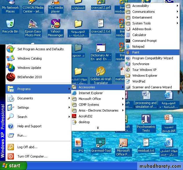 هنالك عدد من الطرائق لتشغيل برامج الحاسوب منه :أولاً : - من قائمة أبــدأ Start ثم programs تظهر قائمة تحتوي على جميع البرامج والتطبيقات الموجودة في جهاز الحاسوب وتحتوي بعض أوامر هذه القائمة على اسهم الى جانبها وهذا يعني ان هنالك قوائم فرعية جديدة منبثقة عن كل من هذه الأوامر ثم أنقر فوق التطبيق الذي تريد تشغيله انظر الصورة :
