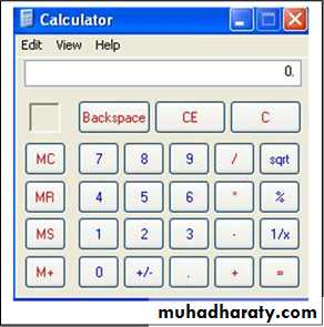 لتشغيل هذا البرنامج أختر برامج Programse من قائمة البــدأ Start ثم وجه المؤشر الى البرامج الملحقة Accessories ومن القائم القرعية أختر الحاسبة Calculator فيظهر برنامج الحاسبة وكما موضح بالصورة :