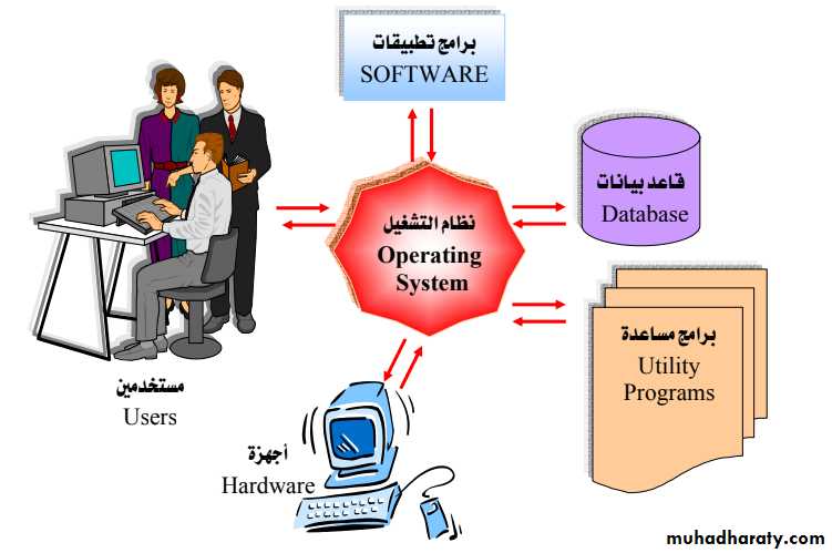 و هي عبارة عن الكيان البرمجي الذي يتكون من مجموعة من التعليمات التي تتحكم في الكمبيوتر و المعدات و تعتبر البرمجيات بمثابة المتمم و المكمل للمعدات فلا قيمة للمعدات بدون البرمجيات .3. أنظمة التشغيل (Operating System) :