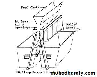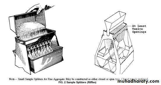 • 3.1 Sample Splitter—Sample splitters shall have an even number of equal width chutes, but not less than a total of eight for coarse aggregate, or twelve for fine aggregate, which discharge alternately to each side of the splitter. For coarse aggregate and mixed aggregate, the minimum width of the individual chutes shall be approximately 50 % larger than the largest particles in the sample to be split. For dry fine aggregate in which the sample will pass the 9.5-mm (3⁄8-in.) sieve , a splitter having chutes 12.5 to 20 mm wide shall be used. The splitter shall be equipped with two receptacles to hold the two halves of the sample following splitting. It shall also be equipped with a straight edged pan. The splitter and accessory equipment shall be so designed that the sample will flow smoothly without restriction or loss of material (see Fig. 1 and Fig. 2).